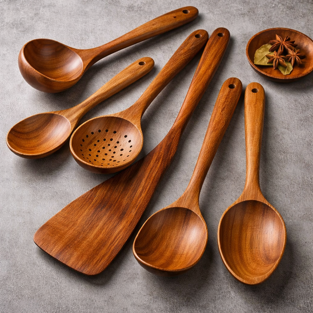Con la giusta cura, i tuoi utensili in teak possono durare molti anni. Il teak è uno dei legni duri più resistenti disponibili: resiste all’umidità, alle crepe e all’usura generale meglio di molti altri materiali.