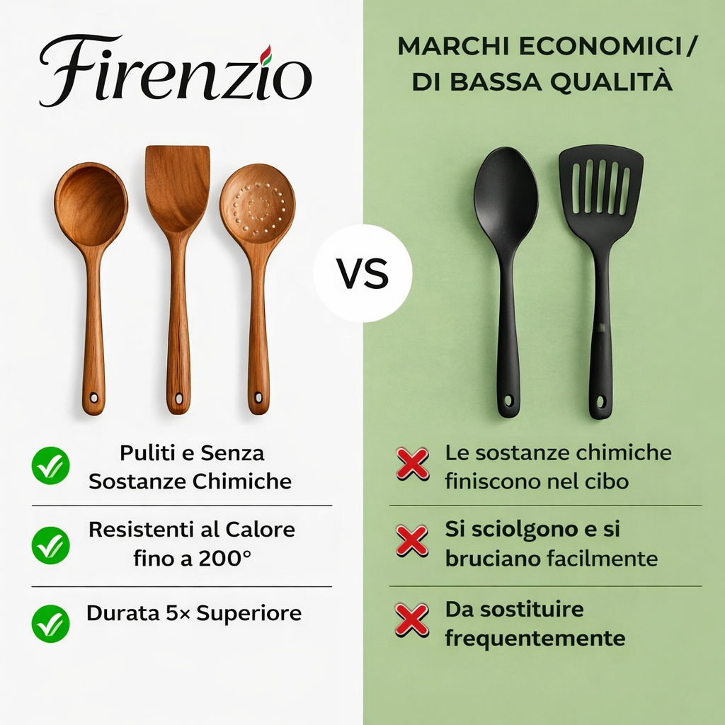 Noi di Firenzio non ci limitiamo a competere: superiamo le aspettative. I nostri utensili in teak offrono qualità premium, resistenza e stile che i marchi più economici semplicemente non possono eguagliare.